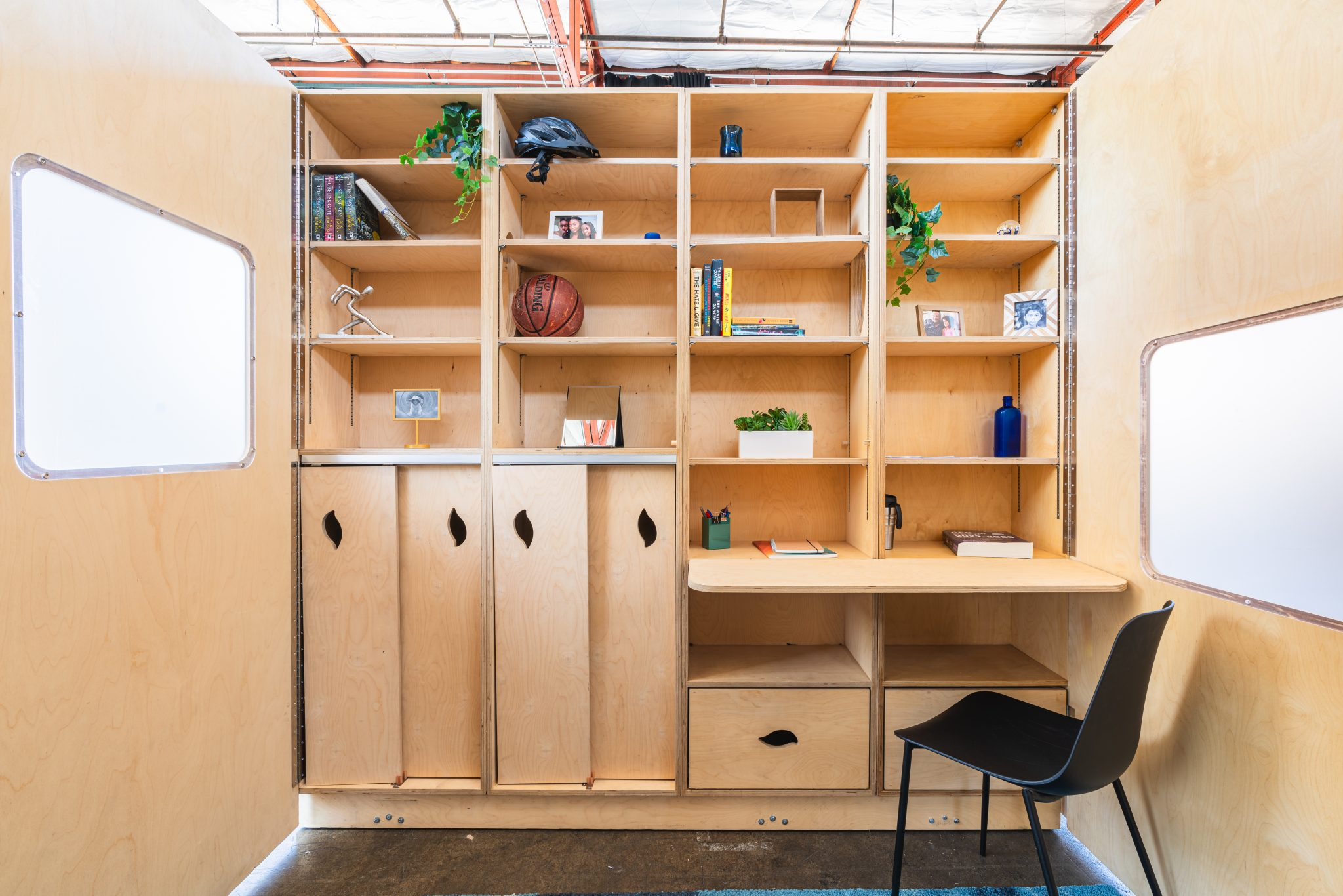 During a tour of the installation, Van Buren spoke to Prism about the importance of including a lot of shelving in the room, allowing residents to display personal items, including those they might have recently purchased or been gifted, as well as those they acquired during their time inside. Those items, along with planters, help add deeper sentiment to the rooms and represent a dramatic departure from prison and jail cells, which are often devoid of color and rarely able to be personalized.