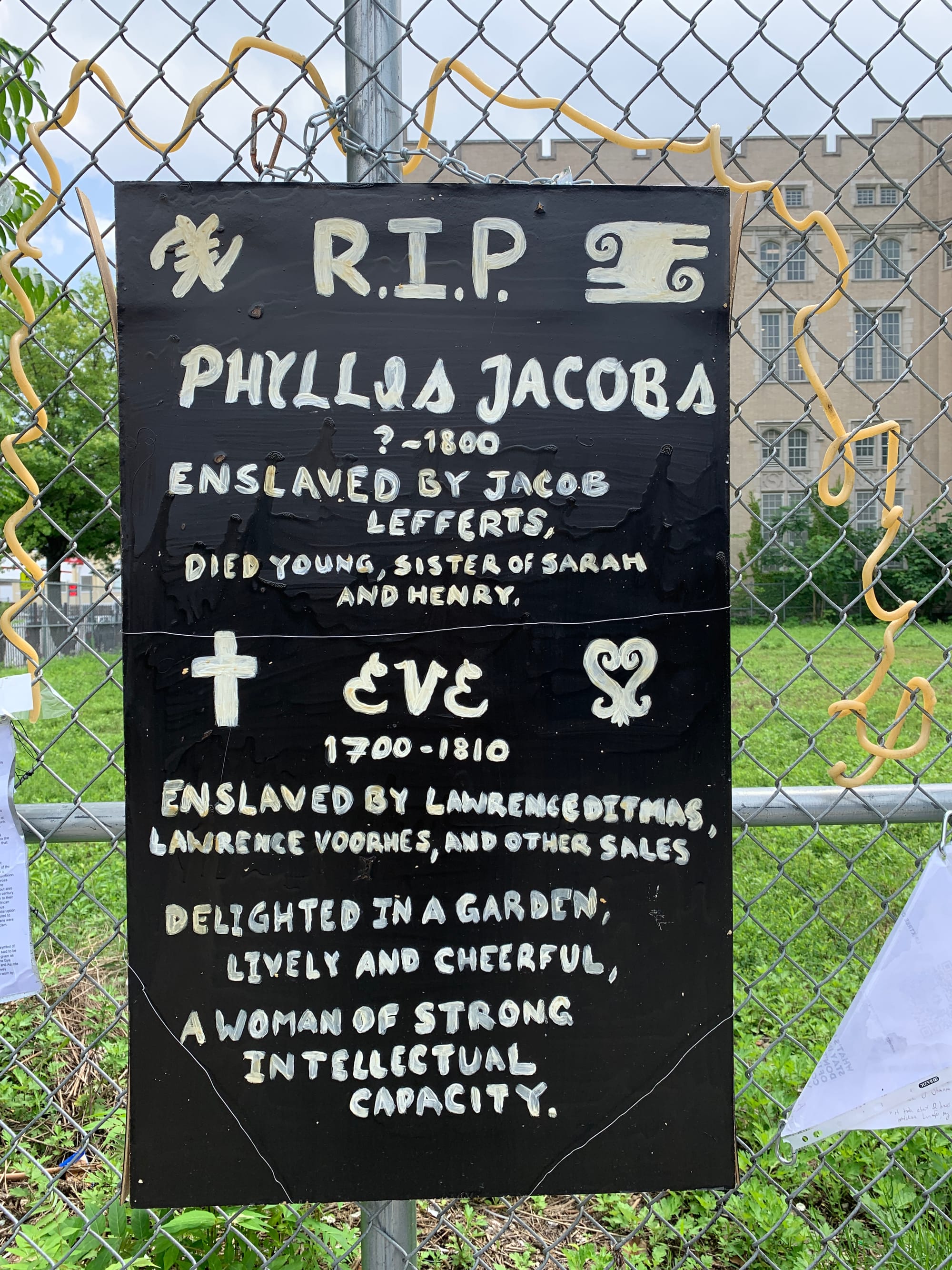 The uneven preservation and erasure of burial sites also shapes the physical landscape of the city, rewriting history for those living in and traveling through it. Just one block west of the African Burial Ground lot is the Flatbush Dutch Reformed Church, a church and cemetery that has interred the members of some of Flatbush’s most well known families—including the Lefferts, Cortelyous, and Vanderbilits, families after which many of the neighborhoods streets are named. The cemetery’s manicured lawns and magisterial headstones make it a popular tourist attraction, in stark contrast to the Flatbush African burial ground, which doesn’t even have a formal placard acknowledging its history. The neighborhood’s topography cements the lives of white slave owners while erasing their slave-holding past and the memories of those they held in bondage.