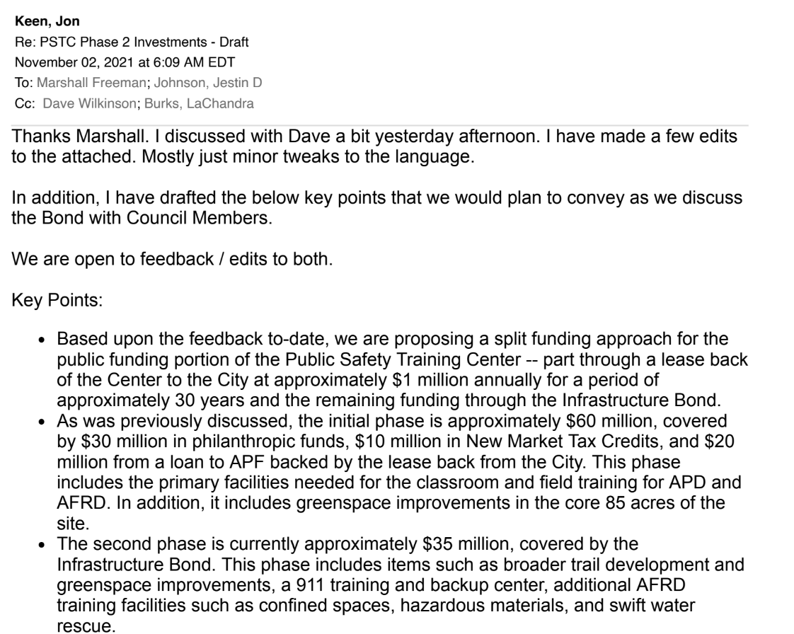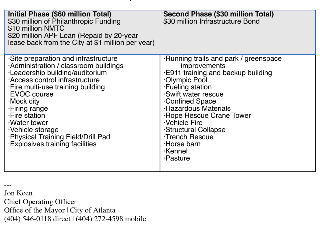 In the email thread, Keen discusses the “key points that we would plan to convey as we discuss the [$30 million lump-sum payment] with Council Members” and includes a breakdown of the funding plan for the Training Center: $30 million to be raised from philanthropic funding, $10 million from federal New Market Tax Credits acquired by the APF, a $20 million private construction loan to APF, and $30 million in public funds from the City of Atlanta.