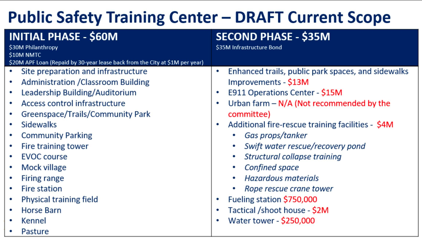 Additionally, the EVOC, stables, and kennels removed for APF to reach its $72.8 million budget projection for initial construction would still need to be built. There are no available cost projections on these items, but if they require additional public funds, it will likely bring the public financial commitment to well over $90 million.
