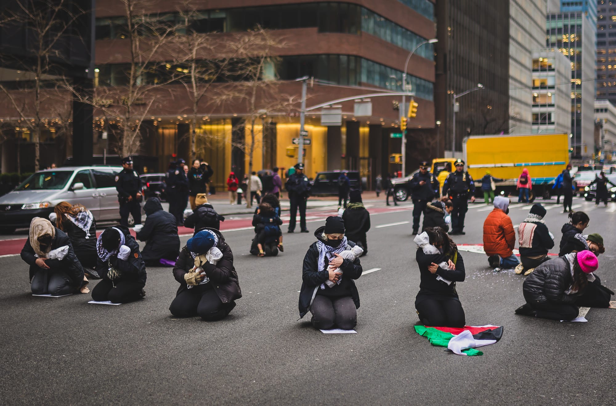 Though it can be powerful, including children in activism is not without risks. In March, organizers in New York City held a rally in front of Sen. Kirsten Gillibrand’s office that culminated with a circle of parents and caregivers kneeling in the street, holding what was made to look like shrouded children. The action was a nod to a widely circulated photo of Palestinian Samia al-Atrash cradling the body of her two-year-old niece.