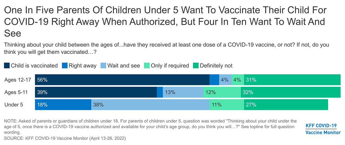 A nationwide Kaiser Family Foundation survey released in May found that 18% of parents of children younger than 5 years old wanted to get their child vaccinated “right away” once the shots were authorized. But 38% said they would wait and see, while 11% said they would vaccinate their children “only if required.”