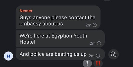 In Cairo the next day, the deportations continued. Members of various delegations were taken from their hotels and interrogated in the streets. Remaining marchers shifted from one hotel to another. Additional actions were floated to the group chat, among the 1,000 or so marchers still present in Cairo.