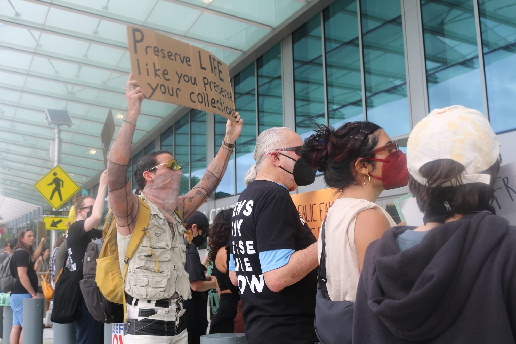 Along the entrance of the convention center, the collective chanted, “Free Palestine,” as well as “Netanyahu, what do you say? How many kids did you kill today?” One poster, held by Miami Artists for Ceasefire organizer (an open letter signed by Miami artists calling for a ceasefire) and Miami-based artist misael soto, said, “Protect Palestine like you protect your collections.”