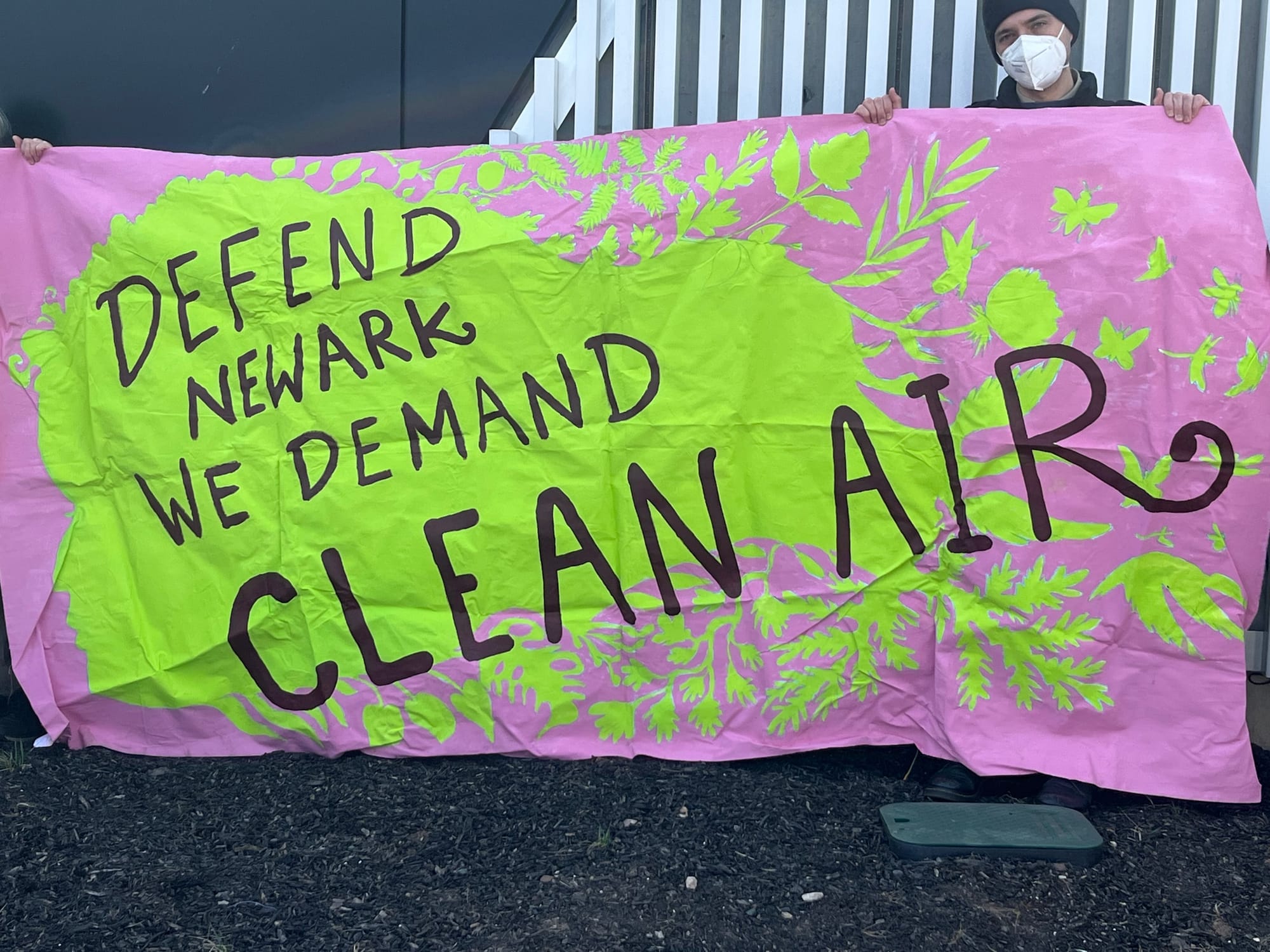 Determined activists, politicians, and concerned residents gathered. Some put on air-filtering masks as they lined up in front of cameras. They held colorful signs, one of them neon pink and green that read: “Defend Newark, We Demand Clean Air.”