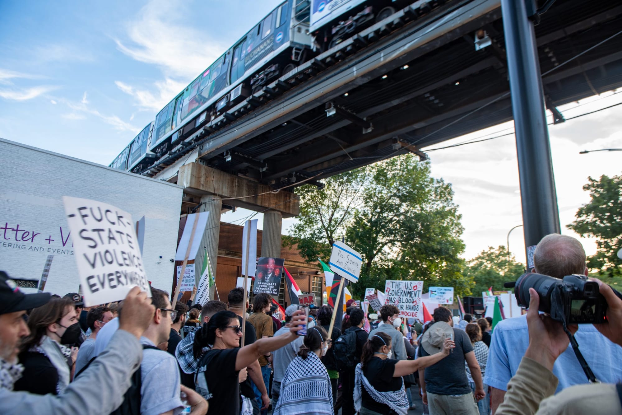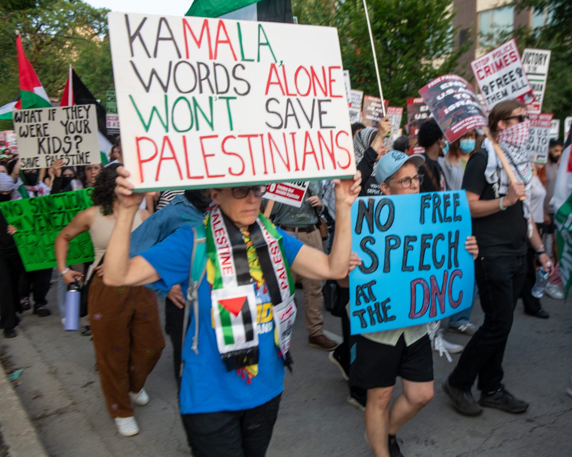 The Coalition to March on the DNC, which organized the protest, held a press conference featuring speakers like Dr. Tammy Abughnaim, who had just returned from providing medical care for civilians injured in Gaza.