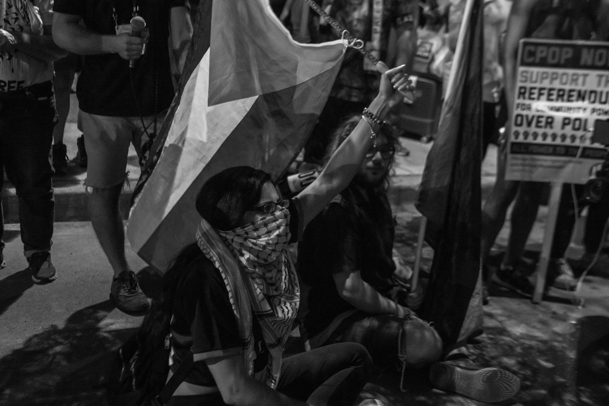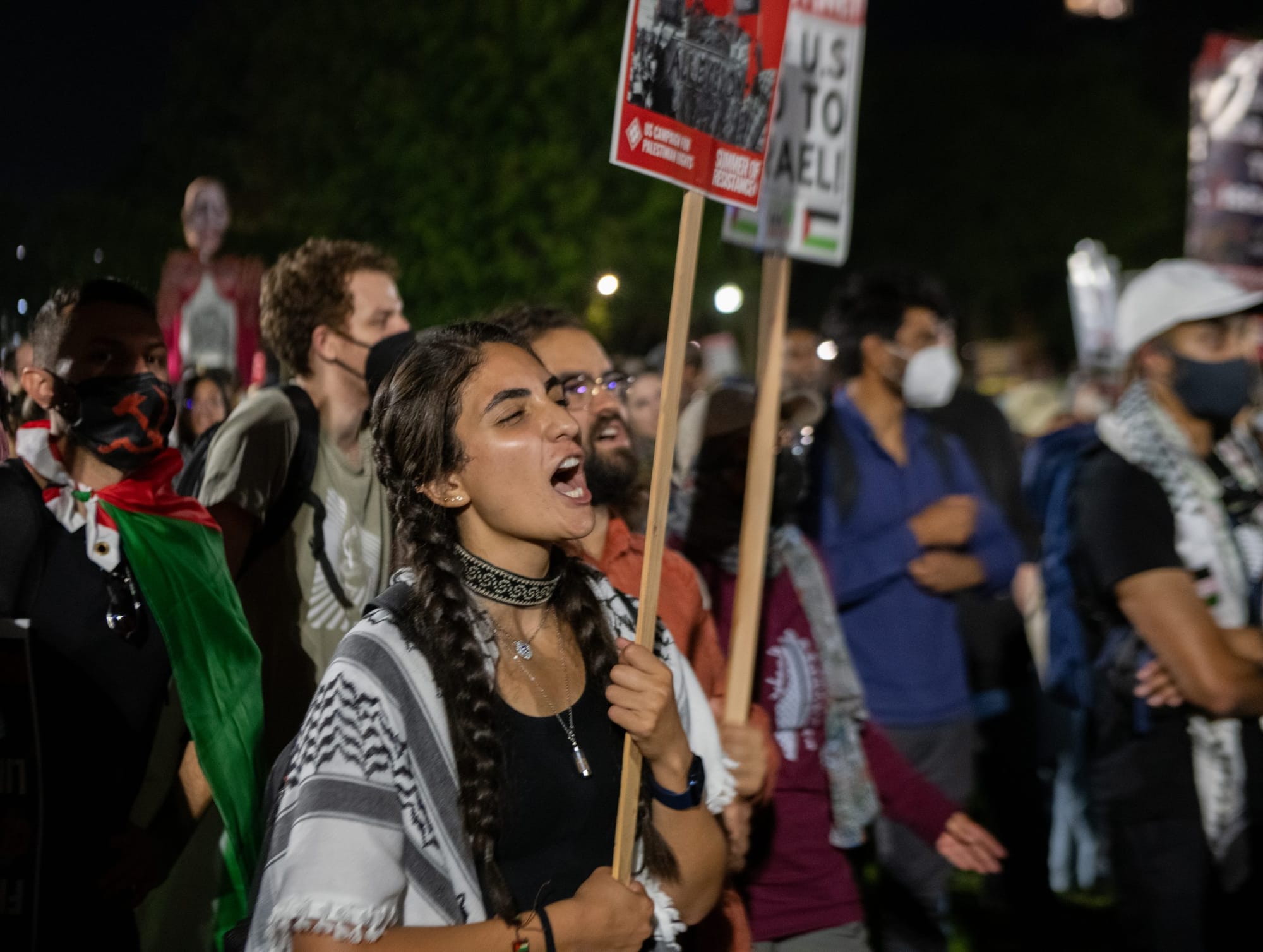 This time, however, the police were out in greater force; hundreds lined the streets around the park. Protest leaders, seeing the police presence, decided to stay in the street to avoid a confrontation. During a protest by a different group at the Israeli consulate earlier in the week, more than 70 people were arrested, including several journalists.