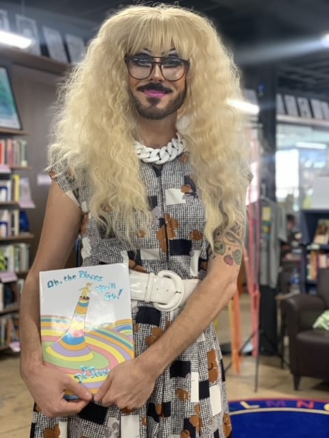Inside, Bookmarks was bustling. Drag Queen Storytime was at capacity, and latecomers hovered around the perimeter, parents with their children balanced atop their shoulders.